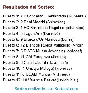 Lista de participantes: 1 FC Barcelona Regal (jorgefuentes), 2 Real Madrid (Shinchan), 3 Lagun Aro (Dainek0), 4 Unicaja Málaga(Tyrone33), 5 FIATC Mutua Joventut (Lorddeaf), 6 Caja Laboral (Dave_culé), 7 Baloncesto Fuenlabrada (Rubenral), 8 UCAM Murcia (Mr.Freud), 9 Bruixa d'Or Manresa (berrin), 10 Valencia Basket (javichubla ), 11 CAI Zaragoza (Jkshop), 12 Blancos Rueda Valladolid (Mrosh).
