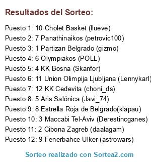 Lista de participantes: 1 Partizan Belgrado (gizmo), 2 Cibona Zagreb (daalagam), 3 Maccabi Tel-Aviv (Derestincganes), 4 KK Bosna (Skanfor), 5 Aris Salónica (Javi_74), 6 Olympiakos (POLL), 7 Panathinaikos (petrovic100), 8 Estrella Roja de Belgrado(klapau), 9 Fenerbahce Ulker (astrowars), 10 Cholet Basket (llueve), 11 Union Olimpija Ljubljana (Lennykarl), 12 KK Cedevita (choni_ds).