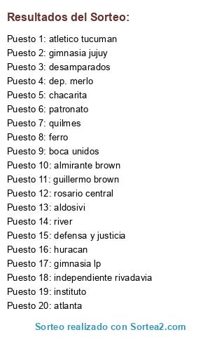Lista de participantes: aldosivi, atletico tucuman, boca unidos, atlanta, defensa y justicia, river, gimnasia lp, gimnasia jujuy, instituto, patronato, quilmes, rosario central, almirante brown, chacarita, dep. merlo, desamparados, ferro, guillermo brown, huracan, independiente rivadavia.