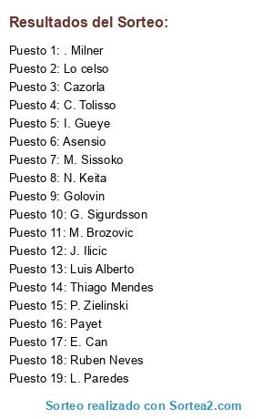 Lista de participantes: . Milner, Cazorla, Payet, M. Sissoko, I. Gueye, J. Ilicic, G. Sigurdsson, L. Paredes, E. Can, P. Zielinski, M. Brozovic, Thiago Mendes, C. Tolisso, Luis Alberto, N. Keita, Ruben Neves, Lo celso, Golovin, Asensio.