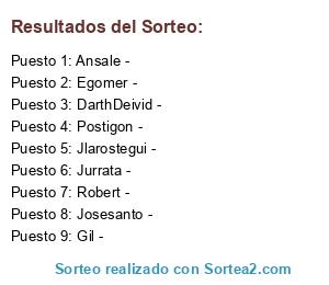 Lista de participantes: Postigon -, Robert -, Gil -, Jlarostegui -, Josesanto -, Ansale -, DarthDeivid -, Jurrata -, Egomer -.