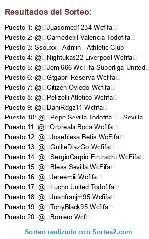 Lista de participantes: Ssouxx - Admin - Athletic Club, @Bless Sevilla WcFifa, @Borrero Wcf, @Carnedebil Valencia Todofifa, @Citizen Oviedo Wcfifa, @DaniRdgz11 Wcfifa, @Gtgabri Reserva Wcfifa, @GuilleDiazGo Wcfifa, @Jemi666 WcFifa Superliga United, @Jereemiii Wcfifa, @Joseblesa Betis WcFifa, @Juanfranjm95 Wcfifa, @Juasomed1234 Wcfifa, @Lucho United Todofifa, @Nightukas22 Liverpool Wcfifa, @Orbreala Boca Wcfifa, @Pelizelli Atletico Wcfifa, @Pepe Sevilla Todofifa - Sevilla, @SergioCarpio Eintracht WcFifa, @TonyBlack95 Wcfifa.