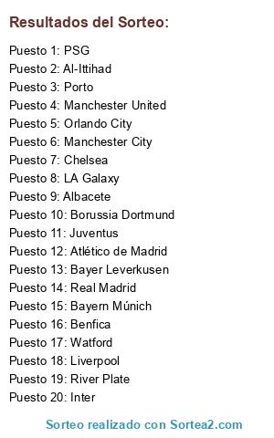 Lista de participantes: River Plate, Juventus, Manchester United, LA Galaxy, Bayer Leverkusen, Atlético de Madrid, Chelsea, Liverpool, Watford, Borussia Dortmund, Porto, Real Madrid, Inter, PSG, Manchester City, Benfica, Al-Ittihad, Albacete, Orlando City, Bayern Múnich.