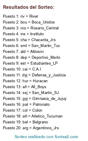 Lista de participantes: arg = Argentinos_Jrs, ars = Arsenal, ban = Banfield, boc = Boca, col = Colon, est = Estudiantes_LP, god = Godoy_Cruz, ind = Independiente, lan = Lanus, new = Newells, rac = Racing, riv = River, san = San_Lorenzo, vel = Velez, ald = Aldosivi, alm = Almirante_Brown, bou = Boca_Unidos, cai = C.A.I, cha = Chacarita_Jrs, dep = Deportivo_Merlo, dyj = Defensa_y_Justicia, fer = Ferro_Carril_Oeste, inr = Independiente_Rivadavia, ins = Instituto, smt = San_Martin_Tuc, tir = Tiro_Federal, all = All_Boys, gim = Gimnasia_LP, oli = Olimpo, qui = Quilmes, tig = Tigre, hur = Huracan, atr = Atletico_Rafaela, uni = Union, ssj = San_Martin_SJ, bel = Belgrano, att = Atletico_Tucuman, gyj = Gimnasia_de_Jujuy, ros = Rosario_Central, pat = Patronato.