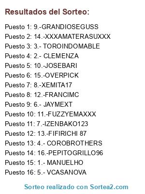 Lista de participantes: 1.- MANUELHO, 2.- CLEMENZA, 3.- TOROINDOMABLE, 4.- COROBROTHERS, 5.- VCASANOVA, 6.- JAYMEXT, 7.-IZENBAKO123, 8.-XEMITA17, 9.-GRANDIOSEGUSS, 10.-JOSEBARI, 11.-FUZZYEMAXXX, 12.-FRANCIMC, 13.-FIFIRICHI 87, 14.-XXXAMATERASUXXX, 15.-OVERPICK, 16.-PEPITOGRILLO96.