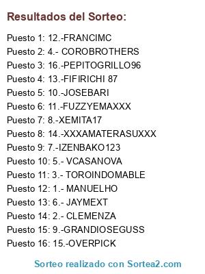Lista de participantes: 1.- MANUELHO, 2.- CLEMENZA, 3.- TOROINDOMABLE, 4.- COROBROTHERS, 5.- VCASANOVA, 6.- JAYMEXT, 7.-IZENBAKO123, 8.-XEMITA17, 9.-GRANDIOSEGUSS, 10.-JOSEBARI, 11.-FUZZYEMAXXX, 12.-FRANCIMC, 13.-FIFIRICHI 87, 14.-XXXAMATERASUXXX, 15.-OVERPICK, 16.-PEPITOGRILLO96.