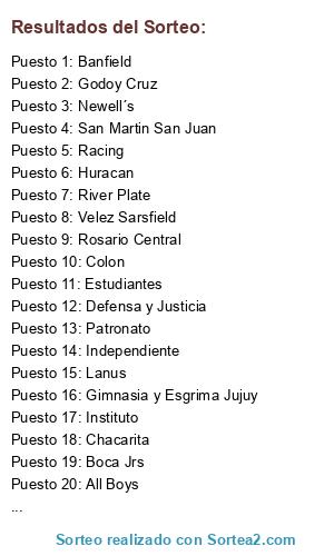 Lista de participantes: River Plate, Lanus, Independiente, San Martin Tucuman, Estudiantes, Boca Jrs, Colon, Gimnasia y Esgrima Jujuy, Godoy Cruz, San Lorenzo, Union, Instituto, Rosario Central, All Boys, Ferro, Racing, Patronato, Gimnasia Y Esgrima La Plata, Newell´s, Chacarita, Banfield, San Martin San Juan, Defensa y Justicia, Huracan, Deportivo Merlo, Arsenal, Velez Sarsfield.