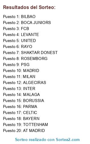 Lista de participantes: INTER, UNITED, BORUSSIA, MADRID, PARMA, CELTIC, BILBAO, MALAGA, MILAN, RAYO, ALGECIRAS, LEVANTE, FCB, BOCA JUNIORS, SHAKTAR DONEST, BAYERN, PSG, TOTTENHAM, AT MADRID, ROSEMBORG.