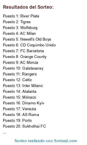 Lista de participantes: PSV Eindhoven, AC Milan, AS Roma, PSG, Sporting, AC Monza, Red Bull Bragantino, Palermo, Bayer Leverkusen, Venezia, Palestino, Pau FC, Lazio, Tigres, Dinamo Kyiv, Atalanta, Mónaco, Orange County, Manchester Utd, Arsenal, FC Barcelona, Newell's Old Boys, Inter Milano, Ajax, Porto, River Plate, Ol. Lyon, Napoli, Galatasaray, KV Oostende, Sukhothai FC, CD Coquimbo Unido, Bayern, Celtic, Rangers, Wolfsburg.