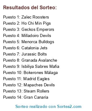 Lista de participantes: Milladoiro Devils (250), Zalec Roosters (200), Bokerones Málaga (150), Geckos Emperors (100), Jurassic Bolts (100), Ho Chi Min Pigs (100), Isbiliya Sabres Mafia (90), Gran Canaria (80), Madrid Eagles (70), Menorca Bulldogs (60), Mapaches Devils (50), Granada Avalanche (40), Steam Rollers (30), Catalonia Jets (10).