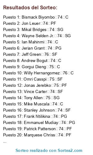 Lista de participantes: Dwight Powell 76 PF, Frank Kaminsky 76 PF, Jeff Green 76 SF, Kosta Koufos 76 C, Markelle Fultz 76 PG, Mirza Teletovic 76 PF, Montrezl Harrell 76 PF, Tomas Satoransky 76 PG, Trevor Booker 76 PF, Tyler Zeller 76 C, Willy Hernangomez 76 C, Zaza Pachulia 76 C, Alan Williams 75 PF, Alec Burks 75 SG, Aron Baynes 75 C, Cedi Osman 75 SG, Chandler Parsons 75 SF, Davis Bertans 75 PF, Dillon Brooks 75 SF, E’Twaun Moore 75 SG, Gorgui Dieng 75 C, James Ennis III 75 SF, JaMychal Green 75 PF, Jerami Grant 75 PF, Joe Johnson 75 SF, Joffrey Lauvergne 75 C, Jonas Jerebko 75 PF, Michael Kidd-Gilchrist 75 SF, Nemanja Bjelica 75 PF, Omri Casspi 75 SF, Raymond Felton 75 PG, Richaun Holmes 75 C, Rodney Hood 75 SG, Skal Labissiere 75 PF, Tony Allen 75 SG, Troy Daniels 75 SG, Willie Reed 75 PF, Andrew Bogut 74 C, Andrew Harrison 74 PG, Anthony Tolliver 74 PF, Bismack Biyombo 74 C, Brandon Knight 74 PG, Channing Frye 74 PF, Cory Joseph 74 PG, Daniel Theis 74 PF, Dante Exum 74 PG, Denzel Valentine 74 SF, Emmanuel Mudiay 74 PG, Frank Ntilikina 74 PG, Garrett Temple 74 SG, Ian Mahinmi 74 C, Jeff Withey 74 C, Jerian Grant 74 PG, Jon Leuer 74 PF, Justin Holiday 74 SG, Langston Galloway 74 SG, Malik Monk 74 SG, Marquese Chriss 74 PF, Mikal Bridges 74 SG, Mike Muscala 74 C, Miles Bridges 74 SF, Milos Teodosic 74 PG, Nick Young 74 SF, Norman Powell 74 SF, Patrick Patterson 74 PF, Quinn Cook 74 PG, Rodney McGruder 74 SG, Royce O’Neale 74 SF, Stanley Johnson 74 SF, Terrence Ross 74 SF, Timofey Mozgov 74 C, Tyler Ulis 74 PG, Tyus Jones 74 PG, Vince Carter 74 SF, Wayne Selden Jr. 74 SG, Yogi Ferrell 74 PG.
