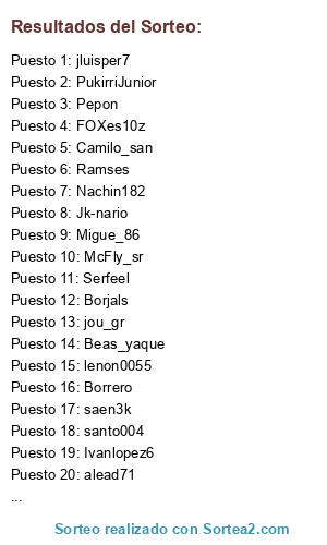 Lista de participantes: Ivanlopez6, Migue_86, rbb_1907_amr., PukirriJunior, Serfeel, Pepon, Magicfelix, Er_Mono, Camilo_san, Carlos9, jluisper7, santo004, FelixBorgesUDLP, lenon0055, Borrero, jou_gr, SCalventeS, Carrijl, Jk-nario, alead71, alexrauher, Borjals, Beas_yaque, Gabripf, McFly_sr, Nachin182, P3dritoBonilla, Ramses, FOXes10z, saen3k.