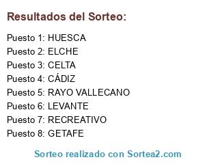 Lista de participantes: HUESCA, LEVANTE, CÁDIZ, RECREATIVO, CELTA, ELCHE, GETAFE, RAYO VALLECANO.