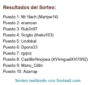 Lista de participantes: Mr Nach (Martpw14), Dpons33, Rub3n97, Lindobal, rgrprz, Manu_Cdlm, CastilloHinojosa (XVImiguelXVI1992), Azarrap, Sciglio (theko103), eramosn.