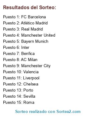 Lista de participantes: AC Milan, Atlético Madrid, FC Barcelona, Bayern Munich, Benfica, Chelsea, Inter, Valencia, Liverpool, Manchester United, Manchester City, Porto, Real Madrid, Roma, Sevilla.