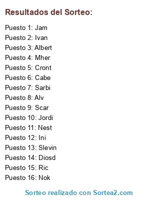 Lista de participantes: Cabe, Slevin, Jam, Ivan, Jordi, Cront, Mher, Ini, Diosd, Sarbi, Ric, Nest, Nok, Scar, Alv, Albert.