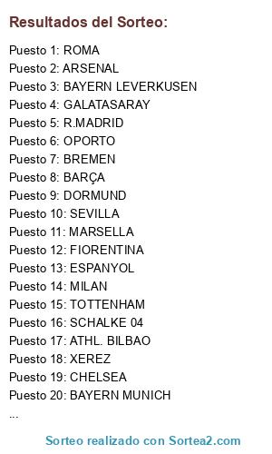 Lista de participantes: MARSELLA, R.MADRID, CHELSEA, SEVILLA, GALATASARAY, FIORENTINA, ROMA, OPORTO, BAYERN MUNICH, JUVENTUS, DORMUND, ARSENAL, BREMEN, ESPANYOL, SCHALKE 04, MILAN, BARÇA, MANCHESTER UTD, ATHL. BILBAO, XEREZ, BAYERN LEVERKUSEN, TOTTENHAM.