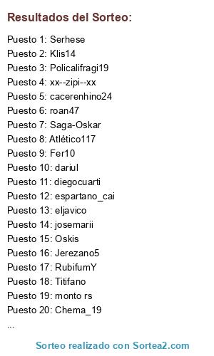 Lista de participantes: runaway58, Fer10, espartano_cai, Titifano, Jerezano5, Klis14, Saga-Oskar, gcabrero, Oskis, cacerenhino24, diegocuarti, Atlético117, roan47, Serhese, monto rs, xx--zipi--xx, Policalifragi19, RubifumY, Chema_19, bocha_racing, josemarii, dariul, eljavico, Adrian_Xta, .