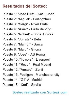 Lista de participantes: *Asier* - Celta de Vigo, *Roca* - Real Madrid, *Jurrata* - Betis, *Miguel* - Guangzhou, *Marc* - Girona, *Sergi* - River Plate, *Robert* - Boca Juniors, *Jose Luis* - Kas Eupen, *Towers* - Liverpool, *Jose* - AS Roma, Postigon - Manchester city, *Xori* - Sevilla, *Gil* At.Madrid, *Ansale* - Zenit.