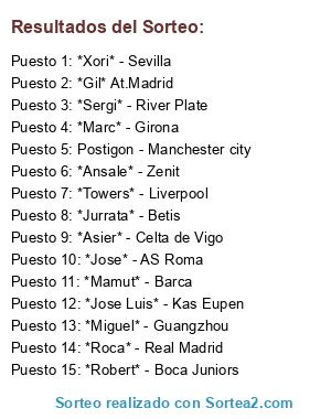 Lista de participantes: *Asier* - Celta de Vigo, *Roca* - Real Madrid, *Jurrata* - Betis, *Miguel* - Guangzhou, *Marc* - Girona, *Sergi* - River Plate, *Robert* - Boca Juniors, *Jose Luis* - Kas Eupen, *Towers* - Liverpool, *Jose* - AS Roma, Postigon - Manchester city, *Xori* - Sevilla, *Gil* At.Madrid, *Ansale* - Zenit, *Mamut* - Barca.