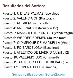 Lista de participantes: AC MILAN (isma_villa), ARSENAL FC (fernando3cc), ATHLETIC CLUB DE BILBAO (Javii), ATLÉTICO DE MADRID (Julivilla12), FC BARCELONA (Bassifree), JUVENTUS FC (Panocha), MANCHESTER UNITED (vendettaguns), OLYMPIQUE DE MARSELLA (Vrael), PALERMO USC (Chamu-8), U.D LAS PALMAS (Lowylogo), VALENCIA CF (Kustodic), WERDER BREMEN (Jaume-marti).