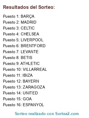 Lista de participantes: ZARAGOZA, GOA, CHELSEA, BAYERN, ATHLETIC, BARÇA, MADRID, IBIZA, CELTIC, BRENTFORD, LEVANTE, VILLARREAL, LIVERPOOL, ESPANYOL, UNITED, BETIS.