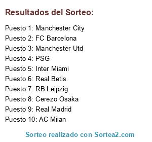 Lista de participantes: Real Madrid, AC Milan, Real Betis, Manchester City, FC Barcelona, Inter Miami, PSG, RB Leipzig, Manchester Utd, Cerezo Osaka.