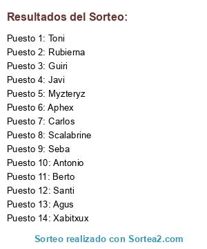 Lista de participantes: Agus, Toni, Seba, Berto, Aphex, Myzteryz, Xabitxux, Carlos, Antonio, Rubierna, Scalabrine, Guiri, Santi, Javi.