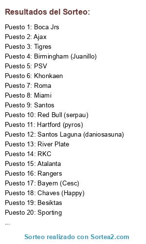 Lista de participantes: Santos, River Plate, PSV, Atalanta, Bayern (Cesc), Monza, Benfica, Roma, Sporting, Sukhothai, Inter, Tigres, Marsella, Chaves (Happy), Le Havre (Sigfridus), Manchester (gravesen), Barcelona, Porto, Red Bull (serpau), Besiktas, Lazio, Melbourne, RKC, Arsenal, Miami, Mónaco, Lyon, Hartford (pyros), Birmingham (Juanillo), Santos Laguna (daniosasuna), Boca Jrs, Lille, Palermo, Orange C., Ajax, Khonkaen, AC Milan (Durbe), Rangers, América MG.