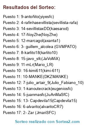 Lista de participantes: 1-kanoutecrack(eugeniosfc), 2- Zar (JmariSFC), 3- guillem_alcolea (GVMPATO), 4-rafinhasevillista(sevillista-rafa), 5-juanmasfc(JuAnMaSfC), 6-alvarito(alvaritoCR7), 7-julio_artair_9(Julio_Fabiano_10), 8-karlito18(karlito10), 9-antoñito(yiyesfc), 10-MANKE(DKZMANKE), 11-mLr(Mario_LR), 12-marcagol(axanta1), 13- Capdevila15(Capdevila15), 14-sevillistaxDD(kaesarxd), 15-javo_sfc(JaVoMiX), 16-kimi611(kimi-611), 17-NoyZhe(NoyZhe).
