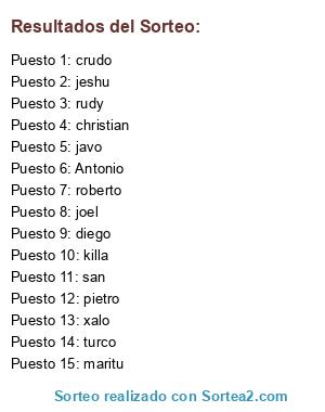 Lista de participantes: diego, xalo, Antonio, jeshu, san, turco, pietro, javo, joel, maritu, killa, crudo, roberto, christian, rudy.