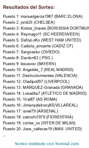 Lista de participantes: MARQUEZ-Granada (GRANADA), Kratos_linares (BORUSSIA DORTMUND), manuelgarcia1987 (BARC ELONA), Angelete_7 (REAL MADRID), Carly777 (MAN. CITY), jordi25 (CHELSEA), Oladipo097 (LIVERPOOL), ianel79 (ARSENAL), lexusxxv (BAYERN), Yiral87 (AS ROMA), Destructormentes (VALENCIA), Losadita7 (ATLÉTICO DE MADRID), Jimenystelrooy85(VILLAREAL), Jose_vallecas19 (MAN. UNITED), Reymago11 (SC HEERENVEEN), cortex_xx (INTER DE MILAN), Sandraul_178 (SEVILLA F.C.), DaNyLoKo (WEST HAM UNITED), Davilon82 ( PSG ), Cadista_amuerte (CADIZ CF), Juanmiole2016 ( BENFICA), Isaakcinho (O. LYON), zatoichi1979 (FIORENTINA), Sargoastur (OVIEDO).