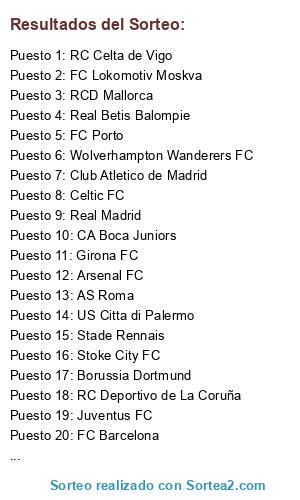 Lista de participantes: CA Boca Juniors, Wolverhampton Wanderers FC, Real Betis Balompie, Celtic FC, US Citta di Palermo, RC Deportivo de La Coruña, RCD Mallorca, Girona FC, RC Celta de Vigo, Borussia Dortmund, Real Madrid, Juventus FC, FC Porto, Athletic Club, AS Roma, FC Lokomotiv Moskva, Stade Rennais, CD Lugo, Rayo Vallecano, Arsenal FC, West Bromwich Albion FC, FC Barcelona, Club Atletico de Madrid, Stoke City FC.