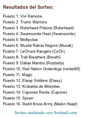 Lista de participantes: Red Nation Underdogs (rocket69), Trumo Warriors, Trail Breathers (Breath), Muzak Rabos Negros (Muzak), Elway Soldiers (Elway), Rotorhead Pistons (Rotorhead), Capones Rooks (Capone), Vivi Ramone, Swamsonite Heat (Swamsonite), Spoon, Moltiputas, Kroketita de Móstoles, Dallas Mambo (Roybatty), Redd Kross Army (Melon Head), LeChuck Rangers (CoCh), Magic.