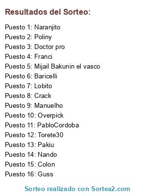 Lista de participantes: Lobito, Doctor pro, Franci, Baricelli, Pakiu, Manuelho, Naranjito, Colon, PabloCordoba, Guss, Torete30, Poliny, Mijail Bakunin el vasco, Overpick, Crack, Nando.