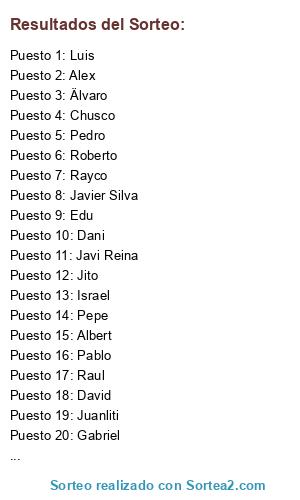 Lista de participantes: Gabriel, Dani, Javier Silva, Luis, Pepe, Edu, Israel, Raul, Juanliti, Javi Reina, Roberto, Rayco, Pedro, David, Alex, Pablo, Albert, Ivan, Älvaro, Chusco, Jito.