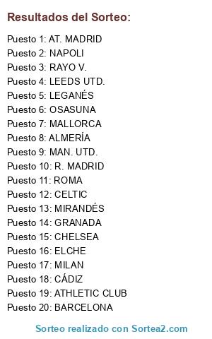 Lista de participantes: OSASUNA, ALMERÍA, CELTIC, R. MADRID, MILAN, ROMA, AT. MADRID, ATHLETIC CLUB, CHELSEA, CÁDIZ, ELCHE, BARCELONA, GRANADA, LEEDS UTD., NAPOLI, LEGANÉS, MAN. UTD., MIRANDÉS, RAYO V., MALLORCA.