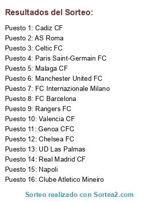 Lista de participantes: AS Roma (20 participaciones), Celtic FC (18 participaciones), Malaga CF (16 participaciones), Chelsea FC (12 participaciones), FC Barcelona (11 participaciones), Manchester United FC (8 participaciones), Paris Saint-Germain FC (8 participaciones), Genoa CFC (8 participaciones), FC Internazionale Milano (6 participaciones), Real Madrid CF (5 participaciones), Rangers FC (4 participaciones), Cadiz CF (3 participaciones), UD Las Palmas (2 participaciones), Clube Atletico Mineiro (2 participaciones), Valencia CF , Napoli.