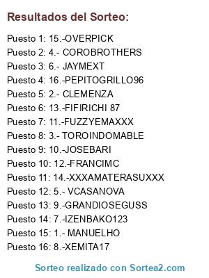 Lista de participantes: 1.- MANUELHO, 2.- CLEMENZA, 3.- TOROINDOMABLE, 4.- COROBROTHERS, 5.- VCASANOVA, 6.- JAYMEXT, 7.-IZENBAKO123, 8.-XEMITA17, 9.-GRANDIOSEGUSS, 10.-JOSEBARI, 11.-FUZZYEMAXXX, 12.-FRANCIMC, 13.-FIFIRICHI 87, 14.-XXXAMATERASUXXX, 15.-OVERPICK, 16.-PEPITOGRILLO96.