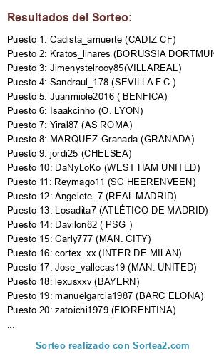 Lista de participantes: MARQUEZ-Granada (GRANADA), Kratos_linares (BORUSSIA DORTMUND), manuelgarcia1987 (BARC ELONA), Angelete_7 (REAL MADRID), Carly777 (MAN. CITY), jordi25 (CHELSEA), Oladipo097 (LIVERPOOL), ianel79 (ARSENAL), lexusxxv (BAYERN), Yiral87 (AS ROMA), Destructormentes (VALENCIA), Losadita7 (ATLÉTICO DE MADRID), Jimenystelrooy85(VILLAREAL), Jose_vallecas19 (MAN. UNITED), Reymago11 (SC HEERENVEEN), cortex_xx (INTER DE MILAN), Sandraul_178 (SEVILLA F.C.), DaNyLoKo (WEST HAM UNITED), Davilon82 ( PSG ), Cadista_amuerte (CADIZ CF), Juanmiole2016 ( BENFICA), Isaakcinho (O. LYON), zatoichi1979 (FIORENTINA), Sargoastur (OVIEDO).
