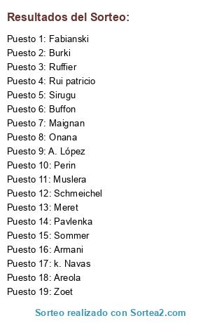Lista de participantes: Buffon, Schmeichel, Fabianski, Rui patricio, Ruffier, Sommer, k. Navas, Perin, A. López, Areola, Sirugu, Muslera, Zoet, Armani, Burki, Maignan, Meret, Onana, Pavlenka.