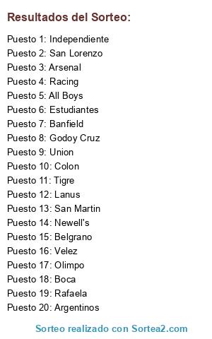 Lista de participantes: All Boys, Argentinos, Arsenal, Rafaela, Banfield, Belgrano, Boca, Colon, Estudiantes, Godoy Cruz, Independiente, Lanus, Newell's, Olimpo, Racing, San Lorenzo, San Martin, Tigre, Union, Velez.