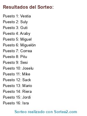 Lista de participantes: Correa(220), Vestia(180), Pitu(140), Araby(110), Miguelón(80), Miguel(61), Suly(50), Mike(40), Joselu(30), Jordi(24), Sesi(18), Mario(15), Riera(12), Isra(8), Sack(7), Guti(5).