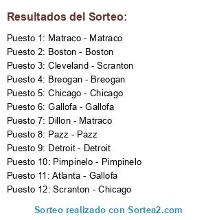 Lista de participantes: Detroit - Detroit (10), Scranton - Chicago (30), Atlanta - Gallofa (40), Dillon - Matraco (50), Pimpinelo - Pimpinelo (60), Breogan - Breogan (70), Gallofa - Gallofa (80), Matraco - Matraco (90), Pazz - Pazz (100), Chicago - Chicago (150), Boston - Boston (200), Cleveland - Scranton (250).