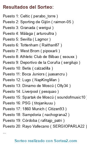 Lista de participantes: Athletic Club de Bilbao ( ssouxx ), Alcorcón ( jota_comunio ), PSG ( titojankuuu ), Málaga ( arturoultra ), Celtic ( perabo_torre ), 1860 Munich ( Citizen93 ), Sporting de Gijón ( raimon-05 ), Spartak de Moscú ( soundofmusic10 ), Deportivo de la Coruña ( sergilujo ), Rayo Vallecano ( SERGIOPARLA22 ), Villareal ( qazwer ), Galatasaray ( JB-recre ), Betis ( calzadilla ), Córdoba ( rafitajp_patri ), Aston Villa ( Javilin88 ), Granada ( werigui ), Atletico de Madrid ( JILLo099 ), West Brom ( pipoxarli ), Dinamo de Moscú ( Olly34 ), Shaktar Donetsk ( Arkhan99 ), Juventus ( juanardo ), Tottenham ( Raithan87 ), Manchester United ( heuver ), Borussia Dortmund ( asturcon3 ), Sampdoria ( nachograna2 ), Club Tijuana ( nerjamartin ), Hércules ( sanguangoo ), Liverpool ( pesquao ), Sevilla ( Lagmor ), Lugo ( NapKingMan ), CSKA de Moscú ( koeESP ), Boca Juniors ( juasancru ).