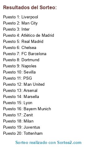 Lista de participantes: FC Barcelona, Chelsea, Bayern Munich, Arsenal, Tottenham, Milan, Man City, Man United, Inter, Real Madrid, Atlético de Madrid, Liverpool, Juventus, Marsella, Sevilla, Napoles, PSG, Lyon, Dortmund, Zenit.