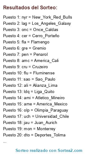 Lista de participantes: anm = Atletico_Nacional_Medellin, cco = Colo_Colo, cor = Corinthians, cru = Cruzeiro, dqu = Deportivo_Quito, dto = Deportes_Tolima, fla = Flamengo, flu = Fluminense, gre = Gremio, int = Inter_PA, mon = Monterrey, nmo = Nacional_Montevideo, olp = Olimpia_Paraguay, pen = Penarol, pum = Pumas_Unam, sfc = Santos_FC, sao = Sao_Paulo, scr = Sporting_Cristal, uli = Universidad_Lima, vdg = Vasco_Da_Gama, ali = Alianza_Lima, amc = America_Cali, ame = America_Mexico, ami = Atletico_Mineiro, bar = Barcelona_Ecuador, bol = Bolivar_LP, bot = Botafogo_FC, cer = Cerro_Porteño, caz = Cruz_Azul, dan = Danubio, dth = Deportivo_Tachira, jau = Juan_Aurich, lag = Los_Angeles_Galaxy, lib = Libertad_Paraguay, ldq = Liga_Quito, nyr = New_York_Red_Bulls, onc = Once_Caldas, pal = Palmeiras, uca = Universidad_Catolica, uch = Universidad_Chile.