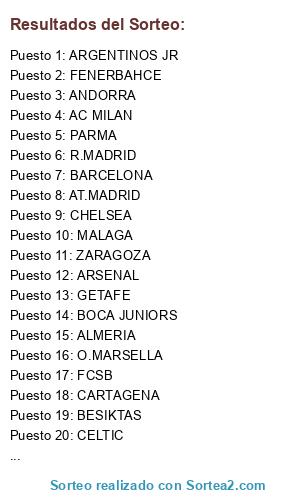 Lista de participantes: MALAGA, BOCA JUNIORS, RACING SANTANDER, GETAFE, FENERBAHCE, RAYO VALLECANO, GRANADA, CELTIC, AC MILAN, ANDORRA, BESIKTAS, AT.MADRID, R.MADRID, ARGENTINOS JR, ARSENAL, CELTA VIGO, ALMERIA, PARMA, ALBACETE, CARTAGENA, BARCELONA, CHELSEA, ZARAGOZA, O.MARSELLA, JUVENTUS, FCSB.