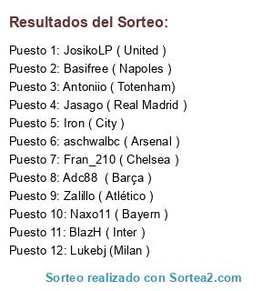 Lista de participantes: JosikoLP ( United ), Jasago ( Real Madrid ), Adc88 ( Barça ), Fran_210 ( Chelsea ), Zalillo ( Atlético ), Iron ( City ), BlazH ( Inter ), aschwalbc ( Arsenal ), Antoniio ( Totenham), Basifree ( Napoles ), Lukebj (Milan ), Naxo11 ( Bayern ).