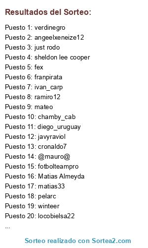 Lista de participantes: javyraviol, chamby_cab, verdinegro, matias33, sheldon lee cooper, fotbolteampro, fex, ramiro12, cronaldo7, mateo, winteer, just rodo, @mauro@, Matias Almeyda, laucharojo09, locobielsa22, pelarc, ivan_carp, franpirata, angeelxeneize12, diego_uruguay, factor_s.